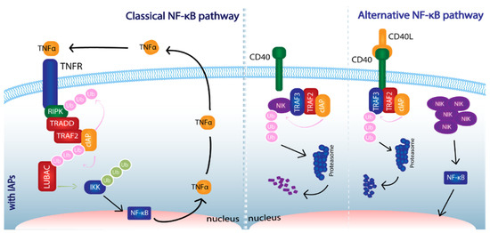 The family of transcription factors known as NF-κB comprises five different proteins belonging to the Rel Homology Domain (RHD)-containing family: RelA (p65), RelB, c-Rel, p105/50 (NF-kB1) and p100/52 (NF-kB1). Only three of the members (RelA, RelB and c-Rel) are produced in their mature forms, while the other two (NF-kB1 and NF-kB2) require a proteolytic cleavage of the precursor’s C-terminal portion. These later molecules do not contain transactivation domains (TAD), which are required for the activation of NF-κB genes; so, they rely on interaction with the other members. In order to become active, different members combine to form dimers. Different signals leading to NF-κB formation combined with different dimer combinations account for the modulation of the different NF-κB transcriptional programs. The two main signaling cascades that activate NF-κB can be classified either as classical (canonical) or alternative (non-canonical) pathways. Importantly, both processes are governed by the addition or deletion of Ub residues on complexes that lead to the activation of the kinases controlling NF-κB activation [43].