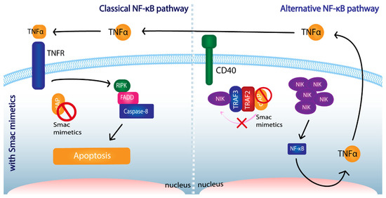 The binding of TNF-α to TNFR can initiate the extrinsic apoptotic pathway. As outlined above, cIAPs have important roles in the regulation of the signaling cascade following the binding of TNF-α to its receptor. Several studies have revealed the importance of TNF-α in the effectiveness of Smac mimetics treatment. To sensitize cells to apoptosis, some cancers require production and response to TNF-α. For instance, LCL161 has been suggested to require the TNF-α pathway and TNF-α production to promote apoptosis [117]. Cancers showing no response to, or no expression of, TNF-α, have been observed to be resistant to Smac mimetics treatment in some circumstances. Therefore, some therapeutic approaches are based on the induction of TNF-α expression by tumor cells. One hypothesis argues that if tumors have access to TNF-α, the suppression of IAPs will halt the NF-κB classical pathway, re-routing it towards caspase-8 dependent apoptosis. At the same time, the lack of said cIAPs would allow the NF-κB alternative pathway to produce further TNF-α, which would feed an autocrine cycle leading to cell death (Figure 3).