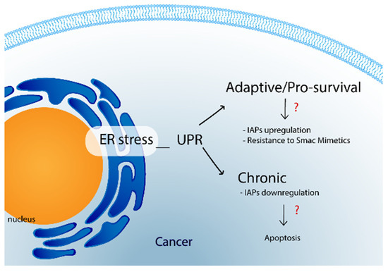 Lastly, given that both the enhancement and the inhibition of stress responses in cancer can achieve reduction in tumor growth, efforts in both directions have been made. The results of some of these approaches are collected in a review from Pakos-Zebrucka et. al. [149]. Despite the above, a direct link between ER stress and Smac mimetics’ resistance has not been established yet and, therefore, there is no information about the study of ER stress modulators and Smac mimetics combined therapy. However, there is evidence pointing towards a possible relationship between ER stress and Smac mimetics’ effectivity that cannot be ignored by future evaluations. Figure 4 summarizes that association.