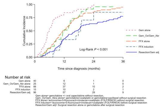 The cumulative probability of progression free survival (PFS) was estimated by the Kaplan–Meier method, considering the studied event as the first event between RECIST progression and all-cause death. Patients alive and free of RECIST progression were censored at the end of follow-up. In order to limit immortal time bias, surgical resection alone (n = 23) was pooled with adjuvant Gemcitabine (n = 87).