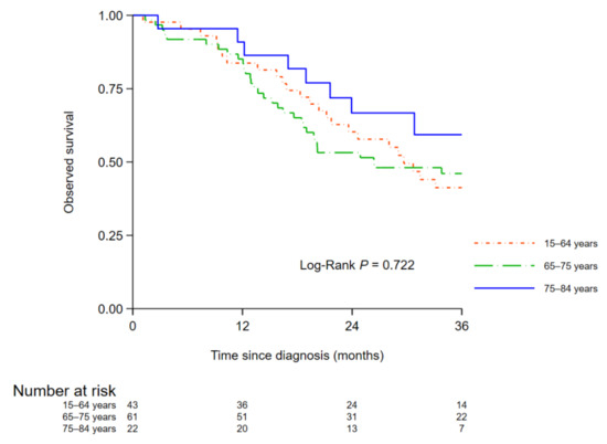 In M0 patients who underwent resection, age was not associated with 3-year OS in univariate (p = 0.722, Figure 2) or multivariate analysis: HR 65–74 vs. <65 = 1.12 (0.68–1.87) and HR 75–84 vs. <65 = 0.76 (0.38–1.55) (p = 0.501 data not shown).