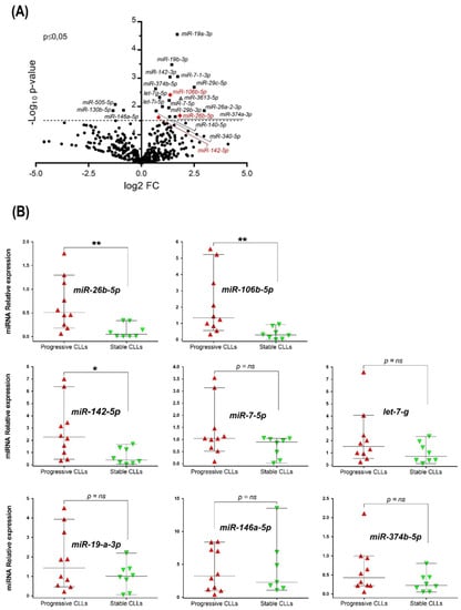 miRNAome analysis and data validation of selected miRNAs differentially expressed between progressive and stable U-CLL subgroups. (A) Volcano plot showing transcriptome analysis of eleven U-CLL patients: 5 stable patients and 6 progressive CLLs. Solid squares = miRNAs differentially expressed (p ≤ 0.05). Red diamond indicates those miRNAs validated by q-PCR (B) Quantitative PCR analysis validating the initial transcriptome data. An additional larger cohort with similar biologic and clinical characteristics (n = 15) was investigated. Mann–Whitney Unpaired test and median with 95% CI are depicted. U6 snRNA were used as endogenous quantity controls for miRNA, and the relative expression was calculated as 2−ΔΔCt. In all cases, p < 0.05 was considered statistically significant, (* = p < 0.05, ** = p < 0.01, ns = not significant).