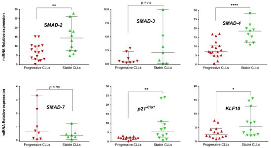 mRNA levels expression of SMAD proteins and of specific target genes modulated by TGF-β pathway activation. Relative expression of SMAD-2, SMAD-3, SMAD-4, SMAD-7, p21−Cip1, and KLF10 mRNAs were compared by q-PCR between progressive and stable U-CLL subgroups. Mann–Whitney Unpaired test and median with 95% CI are depicted. GAPDH was used as an endogenous control, and cDNA of MEC-1 cells were used as a reference sample. The relative expression was calculated as 2−ΔΔCt. In all cases, p < 0.05 was considered statistically significant, (* = p < 0.05, ** = p < 0.01, and **** = p < 0.0001, ns = not significant).