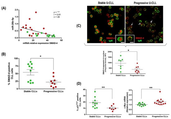 (A–C) Evaluation of mRNA and protein expression levels and cellular localization of SMAD-4 in CLL cells. (A) Correlation between miR-26b-5p and SMAD-4 mRNA expression in the U-CLL subgroups. Red circles = Progressive U-CLL, and green circles = Stable U-CLL (p ≤ 0.0001, Spearman’s rank test, r = 0.81, n = 26). (B) SMAD-4 protein expression evaluated by flow cytometry in CLL cells (CD19+/CD5+) in the different U-CLL subgroups (p = 0.013, Mann–Whitney Unpaired test, n = 19). (C) Confocal microscopy of Smad-4 (red) and IgM (green) from two representative patients; stable (CLL#10) and progressive (CLL#05) are depicted. Scale bar: 5 µm. Specific fluorescence intensity in nucleus and cytoplasm was measured in the different subgroups. Between 100 and 200 cells were counted in each sample (n = 15; stable U-CLLs, n = 7; and progressive U-CLLs, n = 8). Next, MFI in the nucleus and cytoplasm was used to obtain integrated density and compare mean fluorescence intensities of Smad-4 in the nuclei of CLL samples, (p = 0.040, Mann–Whitney Unpaired test, n = 15). (D) p21−Cip1 protein expression evaluated by flow cytometry gating CD19+/CD5+ cells and c-MYC mRNA relative expression from stable and progressive U-CLLs (p = 0.007, n = 17 and p = 0.004, n = 25, respectively, Mann–Whitney Unpaired test) are depicted. In all cases, p < 0.05 was considered statistically significant, (* = p < 0.05, ** = p < 0.01, and *** = p < 0.001, ns = not significant).