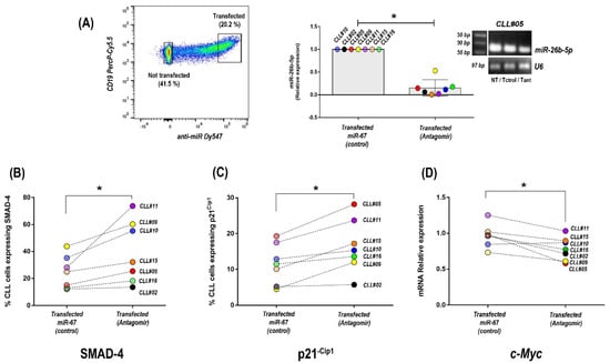 Inhibition of miR-26b-5p and evaluation of SMAD-4, p21−Cip1, and c-MYC expression changes in primary CLL cells of progressive U-CLL patients. (A) Representative dot plots showing transfected CLL cells with specific antagomir targeting miR-26b-5p labeled with Dy547 (left panel). Graph shows relative expression levels of mir-26b-5p in CLL cells after transfection with the specific antagomir and the irrelevant miR-67 control (p = 0.015, signed-rank test, n = 7). Agarose gel 5% stained with Ethidium Bromide shows a representative patient after transfection with the specific antagomir (Tant) and the corresponding controls (not transfected—NT—and transfected with the irrelevant miR-67, Tctrol) (right panel). (B–D) Percentages of cells expressing Smad-4 (B), p21−Cip1 (C), and mRNA levels expression of c-MYC (D) after transfection with the specific inhibitor of miR-26b-5p and with miR-67 (control) in each patient (p = 0.031, p = 0.015, and p = 0.047, respectively, Wilcoxon signed-rank test, n = 7). Each color corresponds to a single patient. In all cases, p < 0.05 was considered statistically significant, (* = p < 0.05).