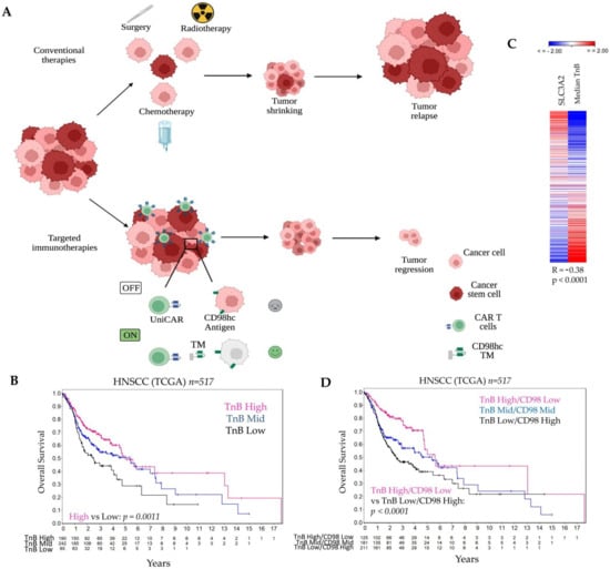 The combination of the CD98hc-targeted immunotherapies and conventional therapies is a promising therapeutic approach for HNSCC. (A) Conventional therapies (i.e., surgery, radiotherapy, chemotherapy) reduce tumor mass, but tumor relapse can occur. Targeted immunotherapies with universal chimeric antigen receptors T cells (UniCAR) controllable by targeting modules (TM) can be more efficient with fewer side effects. Created with https://biorender.com, accessed on 8 March 2022. (B) Analysis of the TCGA dataset for patients with HNSCC shows an association of the TnB and patient prognosis. (C) Expression levels of TnB negatively correlates with SLC3A2 (CD98hc) gene expression. (D) A combination of the low TnB and high CD98hc identifies a high-risk group of HNSCC patients that might benefit from targeted immunotherapies. In Table S1, we provided a list of 84 genes related to T- and B-cell activation and used for the analyses in Figure 1B–D. TM: Targeting Module; TnB: T- and B-cell activation; UniCAR: universal chimeric antigen receptors T cells.