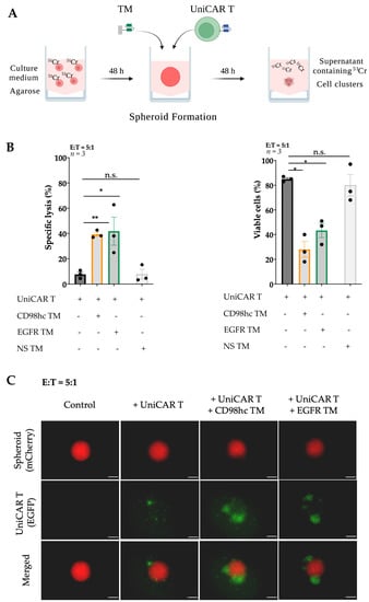 We used previously established [,] Cal33 RR cells stably expressing mCherry protein as a model system. Cells were labeled with 51Cr and seeded for spheroid formation on 1% agarose-coated plates. Approximately two days after seeding, Cal33 RR formed dense multicellular spheroids. The size of these spheroids was ~500–600 μm (Figure S2A). After formation, spheroids were treated with UniCAR T cells at a 5:1 E:T ratio in the presence or absence of TM targeting CD98hc or nonspecific (NS) TM. After 48 h, CD98hc-redirected UniCAR T cells induced significant cancer cell lysis (Figure 2B, left panel) which was found to be comparable with previously described EGFR TM-redirected UniCAR T cells used as a positive control [,]. In the absence of specific TMs or in the presence of NS TM, tumor cells were not significantly affected, showing that targeting of UniCAR T cells was TM-dependent and antigen-specific. These results were validated via flow cytometry by determining the number of viable mCherry-expressing tumor cells (Figure S2B,C and Figure 2B (right panel)). In the presence of CD98hc TM, UniCAR T cells significantly decreased the percentage of viable cells.