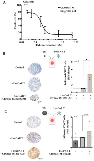 In a 3D setting, the activity of T cells relies on their infiltration rate, which in the particular case of the UniCAR platform also depends on the concentration of TM. For this reason, we first calculated the half-maximal effective concentration (EC50) value of the CD98hc TM in a Cal33 RR 3D model. We found that UniCAR T cells could eliminate tumor cells even at low CD98hc TM concentrations with a half-maximal effective concentration (EC50) of 250 pM (Figure 3A).