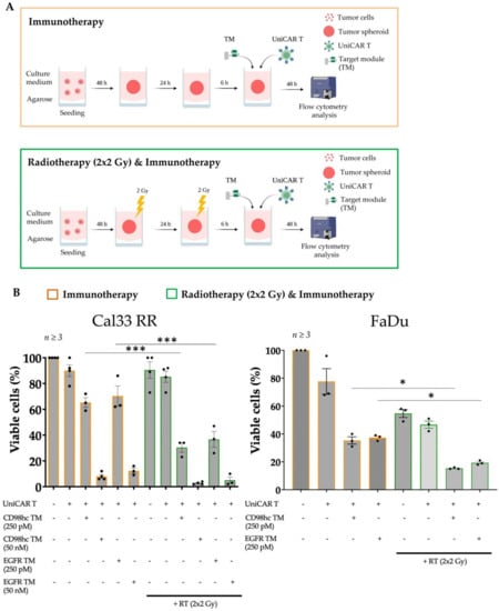 The combination of RT with immunotherapy has a synergistic effect. (A) Scheme, and timeline of procedures for combination therapy. Created with https://biorender.com, accessed on 31 January 2022. Upon spheroid formation, spheroids were given 2 × 2 Gy fractionated irradiation in 2 consecutive days. 6 h after final fraction, UniCAR T treatment was performed in the presence or absence of CD98hc TM. 48 h after treatment, viable cell percentages were analyzed by flow cytometry. (B) RT in combination with CD98-redirected UniCAR T treatment was significantly more efficient in eliminating Cal33 RR and FaDu spheroids than immunotherapy or RT alone. Experiments were performed in triplicates. One-way ANOVA with post hoc Tukey multiple comparison test was applied to calculate the statistical significance of the treatment efficacy (treated vs. control spheroids); error bars, mean ± SEM. * p < 0.05, *** p < 0.001. All calculated p-values are shown in Figure S5A,B. RT: Radiotherapy.