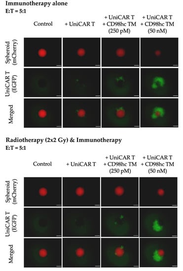 Furthermore, fluorescence imaging showed that in the presence of different concentrations of CD98hc TM, an increased EGFP signal was obtained when UniCAR T cells were cocultured either with pre-irradiated or nonirradiated spheroids, which could be potentially attributed to UniCAR T expansion (Figure 5).