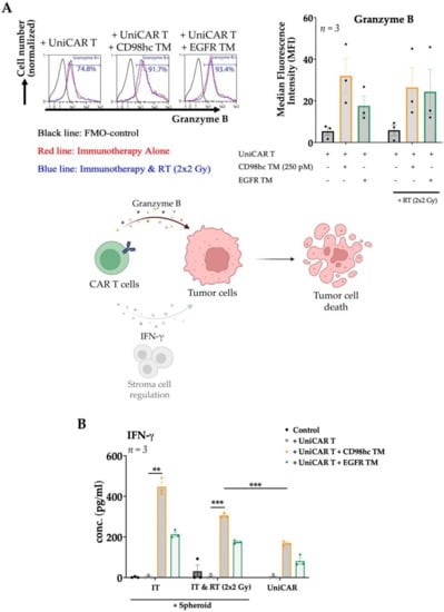 Granzyme B and IFN-γ production of CD98hc-redirected UniCAR T cells. UniCAR T cells were cocultured with Cal33 RR spheroids at an E:T ratio of 5:1 together with CD98hc TM at a concentration of 250 pM. (A) After 48 h, UniCAR T cells were analyzed by flow cytometry for intracellular granzyme B expression. Histograms show the UniCAR T cells positive for granzyme B, % (left panel): fluorescence minus one (FMO) control (black line), immunotherapy (red line), RT combined with immunotherapy (blue line). The bar graph shows the median fluorescence intensity (MFI) of granzyme B stained UniCAR T cells (right panel). CAR T cell utilize granzyme B production and can regulate stromal cells via IFN-γ secretion to mediate tumor cell elimination (lower panel). Created with https://biorender.com, accessed on 24 January 2022. (B) IFN-γ production profile of UniCAR T cells incubated with or without Cal33 RR spheroids in the presence or absence of 250 pM CD98hc TM (E:T = 5:1). After 48 h, cell-free supernatants were analyzed by ELISA for IFN-γ. IT: Immunotherapy; RT: Radiotherapy; IFN-γ: Interferon-gamma Experiments were performed in triplicates. One-way ANOVA with post hoc Tukey multiple comparison test was applied to calculate the statistical significance (treated vs. control spheroids); error bars, mean ± SEM. ** p < 0.01, *** p < 0.001.