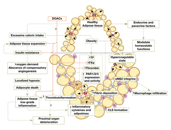 Figure 1. Activation of thromboinflammatory pathways following adipose tissue remodeling in metabolic syndrome and obesity. Excessive calorie intake and insulin resistance lead to adipocyte hypertrophy, thereby reducing adipose tissue oxygenation. The localized hypoxia evokes adipocyte death followed by macrophage infiltration. Beside the upregulation of typical inflammatory mediators, the same processes that trigger inflamed adipose milieu trigger a hypercoagulable state characterized by increased expression and activation of factor X (FXa) and thrombin, as well as different isoforms of the protease-activated receptors (PARs). These activated signaling cascades that are typically involved in blood clotting may lead to a further exacerbation of adipose tissue inflammation. Such mediators could act in a paracrine manner to cause proximal organ deterioration underlying the complications of metabolic disease. Interruption of the FXa or thrombin activity using direct oral anticoagulant (DOACs) drugs might therefore be useful in mitigating the adipose inflammatory state and ameliorating proximal organ damage.