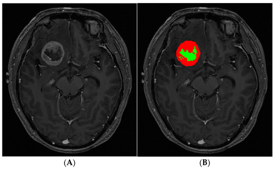 Tumor segmentation was performed on contrast-enhanced 3D T1-weighted SPACE by using the open-source software, ITK-Snap version 3.8.0 (www.itksnap.org; accessed on 20 February 2022) [16]. Necrosis was defined as a non-enhancing area within BM based on the previous studies [17,18]. The workflow of BM segmentation was divided into three stages. In the first stage, we marked examples of different tissue classes (enhancing lesion, necrosis, and background) present in the image by using the paintbrush tool. Random forest classification produced a scalar “speed” image (g) with intensities in the range [−1,1] based on marked tissue classes. In the second stage, we initialized the active contour segmentation mode by placing one or more spherical ‘seeds’ within the earlier produced “speed” image. The evolving estimate was graphically displayed as a color label. We stopped the algorithm when there was no further algorithm growth or when the estimated tumor borders leaked outside the target lesion. These active contour segmentation processes were performed for any enhancing lesion(s) as well as for necrosis. In the third stage, the result of auto-segmentation was reviewed and revised manually by a neuro-radiologist with 8 years of experience (Figure 1). The necrosis to tumor ratio (NTR; necrosis divided by tumor volume) was calculated for further analysis. This process was independently repeated by a neuro-radiologist with 10 years of experience. The average of the NTRs from the two readers was used for further analysis.