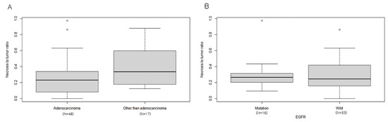 BMs from lung neuroendocrine carcinoma and squamous cell carcinoma showed higher NTR than those from lung adenocarcinoma (0.40 ± 0.26 vs. 0.25 ± 0.22, p = 0.03). NTR was not significantly different between the EGFR mutant group and wild-type group (0.30 ± 0.20 vs. 0.31 ± 0.22, p = 0.89, Figure 3).