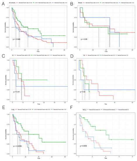 Survival analysis according to the NTR. (A) Kaplan–Meier survival graph for the entire cohort with BMs harboring sparse necrosis, moderately abundant necrosis, and highly abundant necrosis (p = 0.048). (B) Breast cancer. (C) Gastrointestinal cancer. (D) Genitourinary cancer. (E) Lung cancer. (F) NSCLC.
