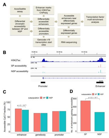 Differential accessibility at regulatory elements between SP and NSP cells. (A) Analysis workflow. (B) An intragenic enhancer within the EGFR gene from the set of the top 60,000 H3K27ac marks identified in J82 cells. (C) CpG sites at enhancers are more accessible in SP cells. The percentages of accessible CpG sites were calculated by dividing the number of accessible CpG sites (β-value increased > 0.3 after DNase treatment) by the total number of CpG sites in the given regions. The null hypothesis of the Chi-square test is that there is no relationship between the CpG sites accessibility (accessible versus not) and subpopulation (SP versus NSP). (D) SP cells have more enhancers that gain accessibility (defined as having at least one accessible CpG site compared with no accessible CpG sites in the same enhancer region in the counter subpopulation) than do NSP cells. The null hypothesis of the Chi-square test is that there is no relationship between the enhancer accessibility (gain versus not) and subpopulation (SP versus NSP).
