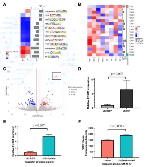 Our strategy to identify the key transcription factors driving the SP phenotype was to identify transcription factor motifs that are enriched at SP enhancers that are both accessible and associated with increased expression levels of their putative target genes. Because it cannot be known a priori which gene is regulated by a distal enhancer, we searched for enriched motifs on SP accessible enhancers located within one megabase of the genes overexpressed in SP cells (Supplementary Tables S1 and S3) using the HOMER motif database [], and we found that the Homeobox (HOX), Forkhead box (FOX), and nuclear receptor (NR) family motifs were significantly enriched in SP cells (Figure 2A). Because members of a transcription factor family share a similar motif, we examined the RNA expression of all transcription factors belonging to the HOX, FOX, and NR families to identify the most likely family member that binds to the SP accessible enhancers. FOXC1 and NR4A3 were significantly overexpressed in SP cells (Supplementary Figure S3). FOXC1 is a transcription factor known to contribute to cancer progression [,]. Furthermore, the transcriptome analysis revealed that FOXC1 was the only significantly overexpressed FOX family transcription factor in SP cells (Figure 2B). Notably, FOXC1 was not only the most overexpressed transcription factor in SP cells, but also the single most overexpressed gene, compared to NSP cells, across the entire transcriptome, supporting the hypothesis that it may have an important function in SP cells (Figure 2C). Using RT-qPCR, we confirmed a significantly increased FOXC1 expression in J82 SP cells, compared to NSP cells (t-test p = 0.007, Figure 2D). We also assessed the J82 FOXC1 expression after cisplatin treatment. We found that the FOXC1 mRNA expression was 5.3-fold higher after cisplatin treatment (t-test p = 0.002, Figure 2E). To test whether this increase was driven by the elimination of a small subset of FOXC1-low cells or the emergence of a small subset of FOXC1-high cells, we also conducted flow cytometry, which showed that cisplatin treatment increased the mean FOXC1 protein levels by 29.5% (t-test p = 0.0003, Figure 2F), and that it did so across the entire cell population (Supplementary Figure S4). These results indicate that bladder cancer cells exhibit an increased FOXC1 expression in drug resistant SP cells, and also in response to cisplatin exposure.