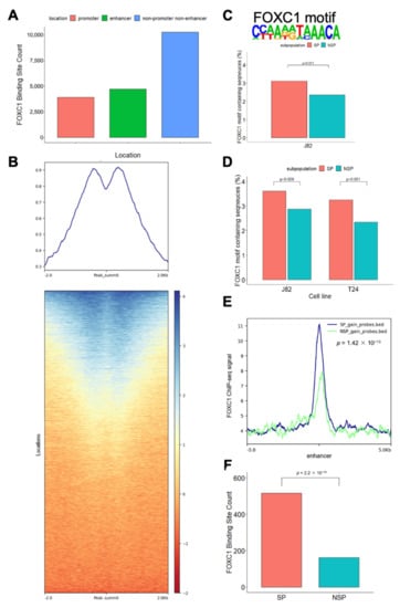 Promoters are heavily enriched with conserved sequences (e.g., TATA box and CpG island consensus sequences), making it difficult to identify cell-type specific transcription factor putative binding sites. Therefore, to identify the motifs associated with transcription factors that are specifically enriched in SP or NSP cells, we performed a motif analysis in the enhancers. Enhancers were defined as the H3K27ac binding sites at least 2000 bp away from any transcription start sites (Gencode version 19), as previously done [,,,]. An accessible enhancer was defined as an enhancer with at least one accessible probe on the AcceSsslble assays. An SP-only enhancer was defined as an enhancer with at least one accessible probe in SP and zero accessible probes in NSP. The putative transcription factor binding sites on the enhancers were defined as the ENCODE DNase hypersensitivity sites on the enhancers within 500 bp from the accessible probes. The differential motif enrichment analysis was performed using HOMER v4.11 [] via findMotifsGenome function, comparing the putative transcription factor binding sites in SP with the comparator (NSP) sequences as the background. De novo FOXC1 motif discovery was performed using HOMER findMotifsGenome function based on the top 500 FOXC1 ChIP-seq peaks on the enhancers using the default size of 200 bp near the peak summits.