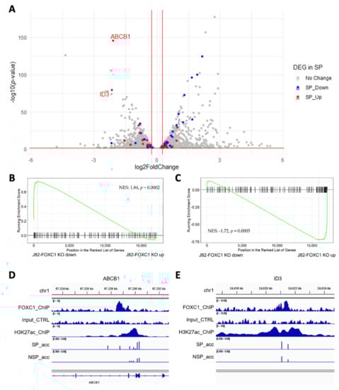 To investigate the FOXC1-regulated gene network, we performed RNA-seq on FOXC1 knockout J82 cells. We identified 1444 genes down-regulated and 1660 genes up-regulated by FOXC1 knockout (Figure 4A; gray dots, see also Supplementary Table S4). Across the transcriptome, we observed that genes up-regulated in SP are down-regulated by FOXC1 knockout (Figure 4A; blue dots). Gene set enrichment analysis also showed that up-regulated genes in SP cells are down-regulated in FOXC1 knockout cells (normalized enrichment score (NES): 1.84, p = 0.0002, Figure 4B). Taken together, these results suggest that FOXC1 regulates many of the genes that are overexpressed in SP cells. Conversely, down-regulated genes in SP cells were up-regulated by FOXC1 knockout (NES: −1.72, p = 0.0005, Figure 4C and red dots in Figure 4A). These observations suggest that transcriptional changes associated with the transition to the SP phenotype are orchestrated by the FOXC1-regulated program.