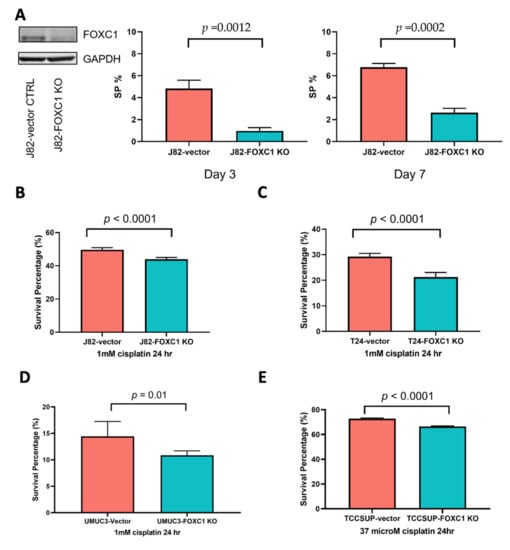 FOXC1 regulates the transition to the SP phenotype and cisplatin resistance in bladder cancer cells. (A) Left panel: Western blot showing a decrease in FOXC1 protein in the knockout cells; the percentage of SP cells is decreased at day 3 (middle panel) and day 7 (right panel) after FOXC1 knockout (FOXC1 KO) in J82 cells. FOXC1 KO decreases survival after cisplatin treatment of J82 (B), T24 (C), UMUC3 (D), and TCCSUP (E) cells. The uncropped blots of Figure 5A can be found in Supplementary Figure S11.