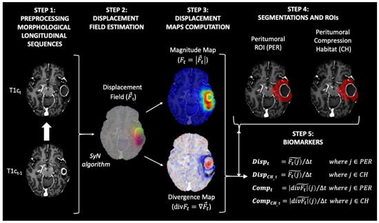 In this study, we propose a methodology for the estimation of biomarkers consisting of the following steps: (1) image preprocessing of each MRI exam, (2) longitudinal intrapatient registration and displacement field estimation, (3) computation of displacement and divergence maps, (4) delineation of peritumoral ROI and identification of compression habitats, and (5) computation of biomarkers (see Figure 1).