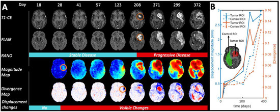 Longitudinal evolution of Patient 4 from day 18 after start of radio-chemotherapy treatment to day 372. For illustration purposes, we did not exclude the first MRI exams with periods shorter 30 days from the previous one in this figure, as described in the inclusion criteria for the rest of the statistical analysis. (A) According to RANO criteria, tumor progression started on day 208. However, the displacement maps show significant deformations already at day 28. Circles in orange highlight preliminary visual evidence of tumor growth. (B) Quantification of the displacement magnitude and absolute divergence in control and tumor ROIs, respectively.