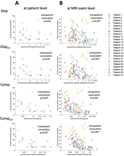 Results of Cox regression for both interpatient and intrapatient associations between biomarkers and patient survival are presented in Table 1. The interpatient association between biomarkers and overall patient survival is visible, especially for the compression biomarkers (Figure 3A). However, due to the low number of cases, the Cox analysis only shows a significant association for Comp and CompCH before correcting p-value for FDR. The intrapatient association between biomarkers and time-to-exitus assessed by Cox analysis is significant (p < 0.05) for all biomarkers, even after correction for FDR. Biomarker Hazard Ratios are higher when they are calculated in the peritumoral compression habitat. In addition, Hazard Ratios are higher for compression biomarkers than for displacement biomarkers.