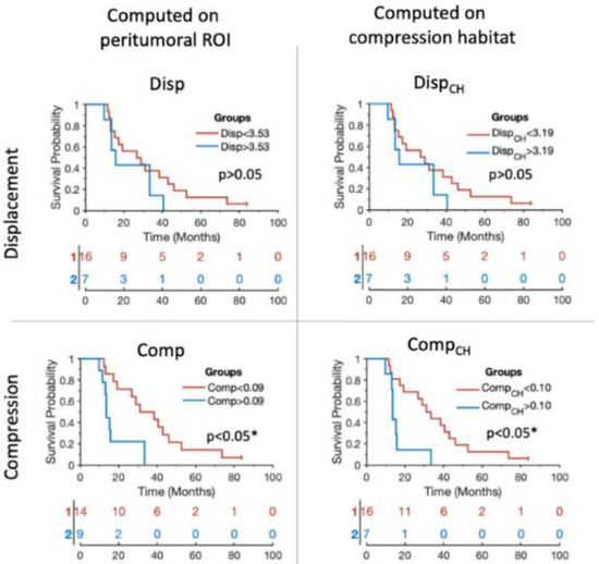 To assess the clinical relevance of the proposed biomarkers, we investigated the interpatient association between proposed biomarkers and the overall survival of each patient. To avoid introducing any bias by not having the same number of MRI scans during follow-up in each patient, the interpatient association analysis based on Cox regression was done using only one value for each patient (i.e., the median of the biomarkers over the entire follow-up). This conservative approach, together with the FDR correction, make this association non-significant in the Cox analysis. The visualization of the data shows a clear pattern between the median compression biomarkers and the overall survival. This pattern is consistent, and is even more evident if we do not use just the median value per patient, but use all available values obtained in each MRI exam acquired during the follow-up. We also analyzed the intrapatient association between biomarkers and time-to-exitus. This intrapatient association assessed by multiparametric Cox analysis is significant for all biomarkers. Analysis of the Hazard Ratios suggests that estimating biomarkers calculated in the compressed habitat rather than in the entire peritumoral area could improve the performance of these biomarkers. These results show that most of the proposed biomarkers could be relevant for monitoring the patient’s evolution during follow-up and help in the estimation of prognosis. Finally, we analyzed whether the proposed biomarkers could be useful for stratifying patients according to their overall survival. The results obtained show that biomarkers based on compression characterization (i.e., Comp and CompCH) are able to divide the population of high and low survivors obtaining high AUC values, a substantial difference between the mean survival of both groups, and elevated Hazard Ratios. These results indicate that compression biomarkers show a stronger association with overall survival of high-grade glioma patients (interpatient variability) while displacement-based biomarkers are slightly more relevant for the study of intrapatient evolution.