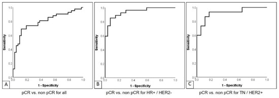 Since neoadjuvant chemotherapy (NAC) was introduced as the first-line defense in the treatment of locally advanced breast cancer, its indications for administration have been gradually extended in pursuing pathological complete response (pCR), particularly in cancers with unfavorable tumor profiles [1,2]. While pCR has been shown to be associated with prolonged survival when compared to non-pCR (partial response or no response), less than 10–50% of breast cancer patients achieve pCR (depending on the intrinsic subtype). Hence, correct assessment of therapy response, and ultimately, the pretreatment prediction of therapy response, is highly desirable to facilitate personalized treatment and prevent delays in effective treatment for non-responders [3].