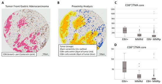 All 409 tumors were grouped according to their EBV and MMR status, which was mutually exclusive for all cases, into three subtypes: EBV+, MMRd, and EBV-MMRp. A total of 11 out of 409 (2.7%) tumors were EBV+, as determined by EBER in situ hybridization, 49 of 409 (12%) were MMRd, with concomitant loss of MLH1 and PMS2 expression by immunohistochemistry, and 349 of 409 (85.3%) were EBV-MMRp. The number of CD8+ intratumoral and peritumoral lymphocytes and their distance to the tumor were recorded for each TMA core, as described above. Representative images of a tumor stained by double immunohistochemistry for CD8 and pan-cytokeratin, as well as the digital overlay after image analysis, is shown in Figure 1A,B. The distribution of all intra- and peritumoral CD8+ lymphocytes (CD8all) or only intratumoral CD8+ lymphocytes (intraepithelial or immediately adjacent, i.e., ≤1 μm from tumor epithelium; CD8int) across the three subtypes is shown in Figure 1C,D.