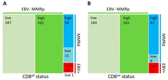 Correlation of tumor-infiltrating CD8+ lymphocytes with EBV and MMR status. Area proportional tree maps are shown based on the number of all (intra- and peritumoral) CD8+ lymphocytes (CD8all) (A) or intratumoral CD8+ lymphocytes (CD8int) (B) per TMA core. Note the increased association of the CD8int high status with the EBV+ and MMRd subtypes in comparison to the CD8all status.