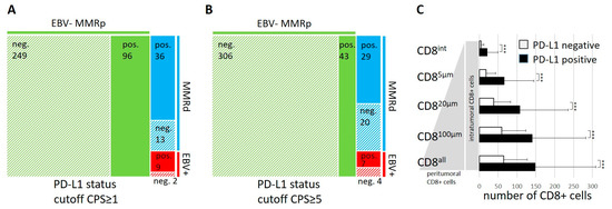 Correlation of PD-L1 expression with EBV and MMR status and tumor-infiltrating lymphocytes. An area proportional tree map is shown based on the PD-L1 status using a CPS ≥ 1 (A) or CPS ≥ 5 (B) as a cutoff. A bar graph demonstrates the association of a positive PD-L1 status (a CPS ≥ 1) with increased numbers of intratumoral and peritumoral CD8+ lymphocytes (C). *** refers to p ≤ 0.001.
