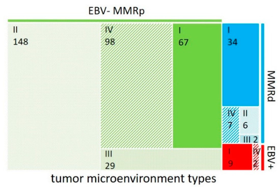 Using the PD-L1 status and the amount of tumor-infiltrating lymphocytes, the tumor microenvironment of solid cancers can be classified into four different immunological subgroups that reflect their immune status [16,20]. In analogy to this proposed scheme, we assigned all cases of the EBV+, MMRd, and EBV-MMRpGCs to one of the four subgroups based on their PD-L1 status and CD8int category: type I (adaptive immune resistance; PD-L1+/CD8int high), type II (immunological ignorance; PD-L1-/CD8int low), type III (intrinsic induction; PD-L1+/CD8int low), and type IV (tolerance; PD-L1-/CD8int high) (Figure 4). EBV+ and MMRdGCs predominantly showed a type I tumor microenvironment, whereas EBV-MMRpGCs most often showed a type II tumor microenvironment.