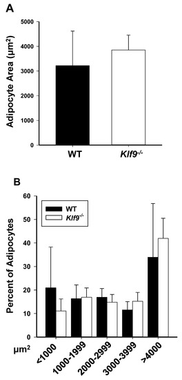 While KLF9 facilitates adipocyte differentiation in vitro, the in vivo role of KLF9 in promoting adipose tissue deposition has not been extensively examined. To evaluate this, male and female WT and Klf9−/− mice were placed on HFD for 12 weeks and examined for weight gain, adiposity, and liver weight (Table 1). Fold change in body weight from PND35 was measured in male and female mice over the 12 weeks on HFD. Aside from one point at week 8 for females (PND 91) in which Klf9−/− mice exhibited greater weight, no significant weight differences were observed between genotypes for males or females (Table 1). Similarly, retroperitoneal and gonadal fat pad weights at study termination were comparable between genotypes for both males and females (Table 1). Further, average adipocyte size (Figure 1A) and adipocyte size distribution (Figure 1B) in female retroperitoneal fat pads did not differ for WT vs. KO. Food consumption did not vary between genotypes within each sex (Figure S1).