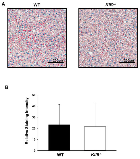 We examined the effect of Klf9 KO on the livers of experimental animals. Male and female Klf9−/− mouse livers were heavier than those of corresponding WT, in both absolute weight and when normalized to body weight (Table 1). However, no change (per constant tissue weight) in liver or serum triglyceride levels was observed for female mice as a function of genotype (Table 1). Similarly, liver lipid content as a function of genotype did not differ for male mice, when evaluated by Oil red O staining (Figure 2). There were no effects of Klf9 KO on liver glycogen, liver cholesterol, and circulating cholesterol levels of female mice (Figure 3A–C).