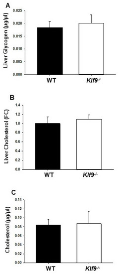 (A) liver glycogen and (B) cholesterol levels, and (C) serum cholesterol levels, did not differ in female WT and Klf9−/− mice on HFD. Bar graphs represent mean ± SD (n = 7–9 mice/genotype).