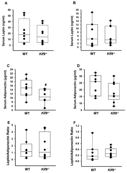 Circulating leptin and adiponectin levels in Klf9−/− and WT mice fed HFD. Serum leptin in male (A) and female (B) WT and Klf9−/− mice on HFD (n = 7–9 mice/sex/genotype). Serum adiponectin in male (C) and female (D) WT and Klf9−/− mice on HFD (n = 7–9 mice/sex/genotype). Serum leptin/adiponectin ratio in male (E) and female (F) WT and Klf9−/− mice on HFD (n = 7–9 mice/sex/genotype). Dots are values for the individual mice. Box plots indicate the upper and lower quartiles, interquartile range, and median (middle line); with whiskers indicating the maximum and minimum points. #, p = 0.065.