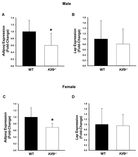Klf9−/− mice had decreased adiponectin mRNA abundance in gonadal fat compared to WT mice, but exhibited no difference from WT mice with respect to gonadal fat leptin mRNA abundance. (A,C) adiponectin mRNA abundance in male and female mice, respectively (n = 7–8/sex/genotype). (B,D) leptin mRNA abundance in male and female mice, respectively (n = 7–8/sex/genotype). Bar graphs are mean ± SD. * p ≤ 0.05, significant difference between genotypes.