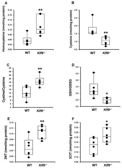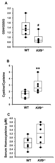 Klf9−/− female mice have increased serum oxidative stress compared to WT female mice. Serum ratios of GSH/GSSG (A) and cystine/cysteine (B), and serum levels of homocysteine (C) were measured in female WT and Klf9−/− mouse serum by HPLC coupled with coulometric electrochemical detection. Dots represent values for individual mice (n = 6/genotype). Box plots indicate the upper and lower quartiles, interquartile range, and median (middle line); with whiskers indicating the maximum and minimum points. ** p ≤ 0.001 and # 0.1 < p < 0.05.