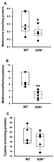 Female Klf9−/− mice have reduced liver methionine/homocysteine ratio compared to WT mice, when fed HFD. (A) Methionine, (B) methionine/homocysteine ratio, and (C) cystine in female WT and Klf9−/− mouse livers were measured by HPLC coupled with coulometric electrochemical detection. Dots represent values for individual mice (n = 6/genotype). Values are indicated as ** p ≤ 0.001 and # 0.1 < p < 0.05.
