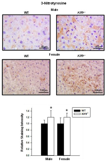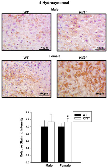 To confirm the increased nitrosative stress and to also examine lipid peroxidation status, liver tissue sections (WT, Klf9−/−, males, females) were subjected to IHC for 3NT and 4-hydroxynonenal (4HNE). Correspondent with the HPLC data, increased 3NT immunoreactivity was observed for both female and male Klf9−/− livers relative to WT (Figure 8). Immunostaining for 4HNE was significantly increased in the livers of female Klf9−/− mice compared to WT (Figure 9). However, 4HNE levels did not differ in male mouse livers of the two genotypes (p = 0.14) (Figure 9).