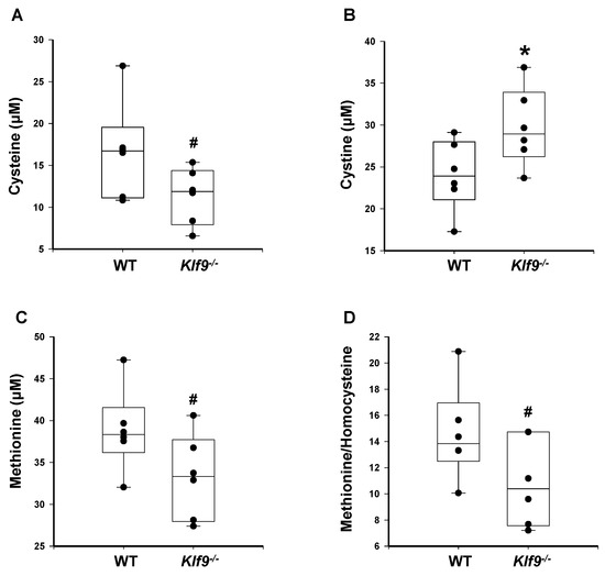 HFD-fed female mice null for Klf9 exhibit trends toward reduced serum cysteine, reduced serum methionine, and reduced methionine/homocysteine ratio; as well as significantly increased serum cysteine, when compared to WT. Serum levels of (A) cysteine, (B) cystine, (C) methionine, and (D) methionine/homocysteine (ratio) in female WT and Klf9−/− mouse livers were measured by HPLC coupled with coulometric electrochemical detection. Dots represent values for individual mice (n = 6/genotype). Box plots indicate the upper and lower quartiles, interquartile range, and median (middle line); with whiskers indicating the maximum and minimum points. Differences are indicated as * p ≤ 0.05 and # 0.1 < p < 0.05.