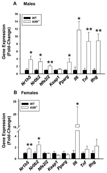 We quantified hepatic mRNA levels for several nuclear receptor genes (Nr1h5, Nr0b2, Pparg), antioxidant pathway regulator genes (Nfe2l2, Keap1), and pro-inflammatory genes (Il6, Tnf, and Ifng), all of which have been implicated in liver cyto-protection, regeneration, and growth. Male Klf9−/− mouse livers exhibited increased steady-state levels of all studied genes with the exception of Keap1, when compared to WT counterparts (Figure 12A). Female mice null for Klf9 had increased steady-state levels of Nr1h5, Nr0b2, and Il6 when compared to WT (Figure 12B). These data suggest a more heightened pro-inflammatory state in male than female Klf9−/− mouse livers under the HFD paradigm, when compared to WT counterparts.