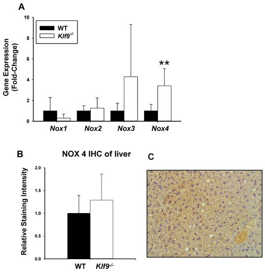 Lastly, we examined hepatic mRNA abundance for four members (NOX1, NOX2, NOX3, and NOX4) of the NOX/DUOX family of proteins, since these are expressed in the liver where they contribute to hepatic ROS generation [28,29]. Nox4 mRNA was more highly expressed in Klf9−/− than WT livers (Figure 13A); by contrast, no significant differences in Nox1, Nox2, and Nox3 mRNA abundance were observed with genotype. However, unlike the differing pattern of Nox4 mRNA abundance with genotype, IHC staining intensity for the corresponding protein was comparable between Klf9−/− and WT livers (Figure 13B,C).