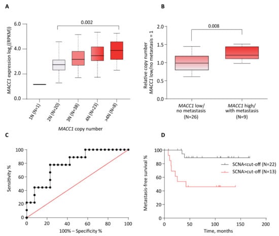 By using the Charité cohort (N = 35), we tested next for a correlation of CRC patients, who are low in MACC1 and have no distant metastasis, and those patients who are high in MACC1 and have metastasis, with respect to SCNA. Impressively, we found significantly higher SCNAs in the MACC1 high/with metastasis group vs. MACC1 low/no metastasis (Mann–Whitney p = 0.008, t-test p = 0.005; Figure 1B). The grouping in MACC1 low/high expressing patients was performed earlier by ROC analysis [4] (Figure 1C). The median metastasis-free survival SCNAs < cut-off vs. > cut-off is significantly different (p = 0.0035 log-rank (Mantel–Cox) and p = 0.002 Gehan–Breslow–Wilcoxon; cut-off = 3.34 copies) (Figure 1D). This cut-off was associated with a sensitivity of 77.78% and a specificity of 76.92%. For SCNA > cut-off patients, the metastasis-free survival was 42.47 months; for the SCNAs < cut-off patients, the metastasis-free survival was undefined (these patients do not have any metastasis). The longest follow-up time was 168 months (then the patient died), the shortest was 8 months. Taken together, by the inclusion of the MACC1 SCNA, we cannot only predict the MACC1 expression level but potentially also the distant metastatic capacity of CRC patients.