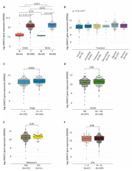 MACC1 expression in the COAD-READ dataset. (A), Box plot showing MACC1 mRNA expression values of the COAD and READ samples stratified by normal or tumor tissue types. (B–F), MACC1 mRNA expression by tumor (B), localization, (C), stage, (D), patient nodal invasion, (E), patient metastatic status, (F), size. Box plots (A–F), MACC1 data are RNA-Seq data RSEM-log2 transformed, horizontal bars indicate median values, boxes are interquartile range, whiskers indicate values within 1.5 times interquartile range. The number of samples (N) per group is given in brackets.