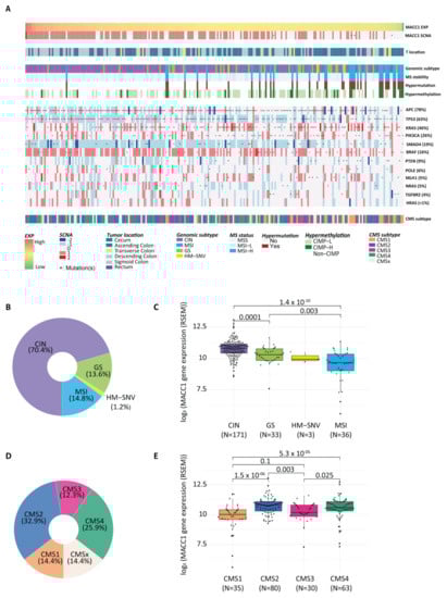 MACC1 was next analyzed in the context of the transcriptomic-based consensus molecular subtypes (CMSs) which were established based on the tumor gene expression [33]. In the cohort reported [28], CRCs classified into CMS1 35/243 (microsatellite instability immune, 14.4%), CMS2 80/243 (canonical, 32.9%), CMS3 30/243 (metabolic, 12.3%) and CMS4 63/243 (mesenchymal, 25.9%), and CMSx 35/243 (indeterminate or undefined: 14.4%) (Figure 3D). MACC1 expression levels were associated with the tumor CMS subtypes (median: CMS1 = 10.1, CMS2 = 10.8, CMS3 = 10.2, CMS4 = 10.6, Kruskal–Wallis test p = 1.6 × 10−6) (Figure 3A,E). MACC1 expression was higher in tumors of the CMS2 subtype compared to CMS1 and CMS3 (Wilcoxon test p = 1.5 × 10−6 and p = 0.003, respectively) but not CMS4. Similarly, MACC1 was higher in CMS4 subtype than in CMS1 and CMS3 (Wilcoxon test p = 5.3 × 10−5 and p = 0.025, respectively). MACC1 levels tended to be lower in CMS1 than in CMS3 subtype (Wilcoxon test p = 0.1). In summary, we showed here that tumors with high MACC1 expression and increased SCNAs were mostly seen in CIN tumors of the CMS2 subtype, which is the epithelial type with marked WNT activation, and of the CMS4 subtype defined as mesenchymal with prominent transforming growth factor activation, stroma invasion and angiogenesis. Tumors of the CMS3 subtype were frequently GS with overall lower MACC1 expression levels. Finally, the CMS1 subtype aggregated mostly MSI, HM-SNV and CIMP-H tumors with normal ploidy and frequently very low MACC1 mRNA expression.
