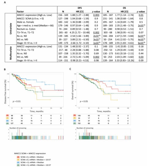 MACC1 SCNA and expression and CRC patient DFS and OS. (A), Univariate and multivariate Cox analysis (DFS and OS) in COAD-READ TCGA patients (N = 218). HR: Hazard ratio; CI: Confidence interval. N represents the number of cases in each group. Wald test was used to identify the risk factors with patient DFS and OS. Significance setup at p < 0.05. (B,C), Combined Kaplan-Meier analysis of MACC1 status (SCNA and mRNA). (B), DFS according to the MACC1 status, (C), OS according to the MACC1 status.