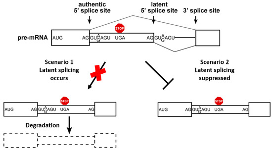 In an attempt to understand the rules of SOS, we showed that the presence of an in-frame stop codon plays a role in suppressing splicing from the latent sites. Specifically, we demonstrated, through a large series of mutations of gene constructs, that removal of stop codons led to activation of splicing at the latent SSs (latent splicing). These mutations included mutations in the stop codons to produce sense codons, and frame shift mutations by insertion or deletion of nucleotides upstream of the stop codons [35,36,39]. Three different lines of experiments ruled out the possibility that the mutations we made affected splicing through the damage of a splicing control element [10,45]: (i) by demonstrating that removal of only one of the two in-frame stop codons in a CAD-WT minigene construct (Figure 2a) was not enough to produce latent splicing; (ii) by revealing that mutating an in-frame stop codon to the remaining two stop codon sequences did not elicit latent splicing, but mutating the stop codon to a missense codon did; and (iii) by confirming that frame shift mutations, further away from the in-frame stop codon, elicited latent splicing [39].