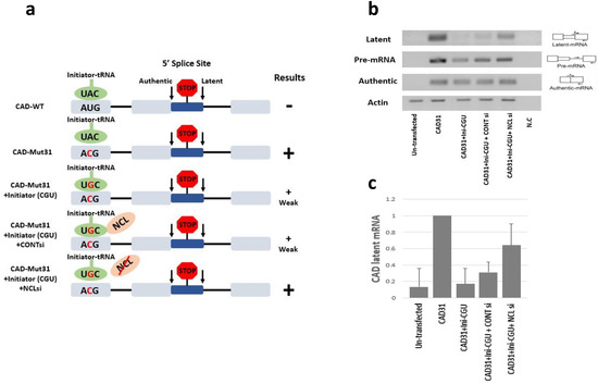 A potential role for NCL in SOS. The recovery of SOS by ini-tRNA complementation is NCL dependent. (a) Hypothesis and experimental design. Assuming that ini-tRNA is essential in establishing a reading frame required for the SOS mechanism, latent splicing is suppressed when CAD-WT is complemented by ini-tRNA with a complementary anticodon (CAU). It is expected that abrogating SOS in an AUG to ACG mutant (CAD-Mut31), elicits latent splicing, which is rescued by a mutant in-tRNA, which carries a complementary anticodon (CGU) mutation, resulting in a reduced level of latent splicing (CAD-Mut31). These assumptions were verified [40]. Notably, recovery of SOS by ini-tRNA complementation is disrupted by NCL knockdown using siRNA. Scheme: gray box, exon; line, intron; blue box, latent exon; +(w) indicates weak latent splicing. (b,c) Experimental verification using the CAD minigene. HEK 293 cells were co-transfected with CAD-Mut31 (CAD31), which carries the mutated ACG start-codon; with CAD31 together with mutant ini-tRNA, in which the antisense codon was mutated to CGU (ini-CGU), as indicated. Co-transfection of CAD-Mut31 with mutant ini-tRNA and with si-RNA directed against NCL (NCLsi), disrupt the complementation. (c) Graphs represent an average of three independent experiments. The densitometric ratio of CAD31 was normalized to 100%. Adapted from ref. [46].